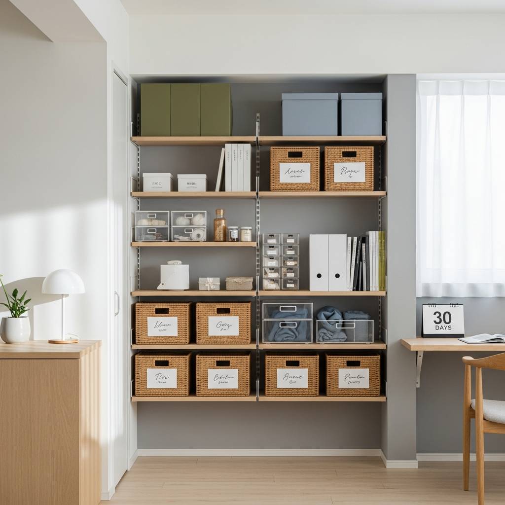 物の定位置が決まっていないことが散らかりの大きな原因です。「取りやすく、戻しやすい」を基本原則に、使用頻度と使用シーンに合わせて収納場所を決めていきます。