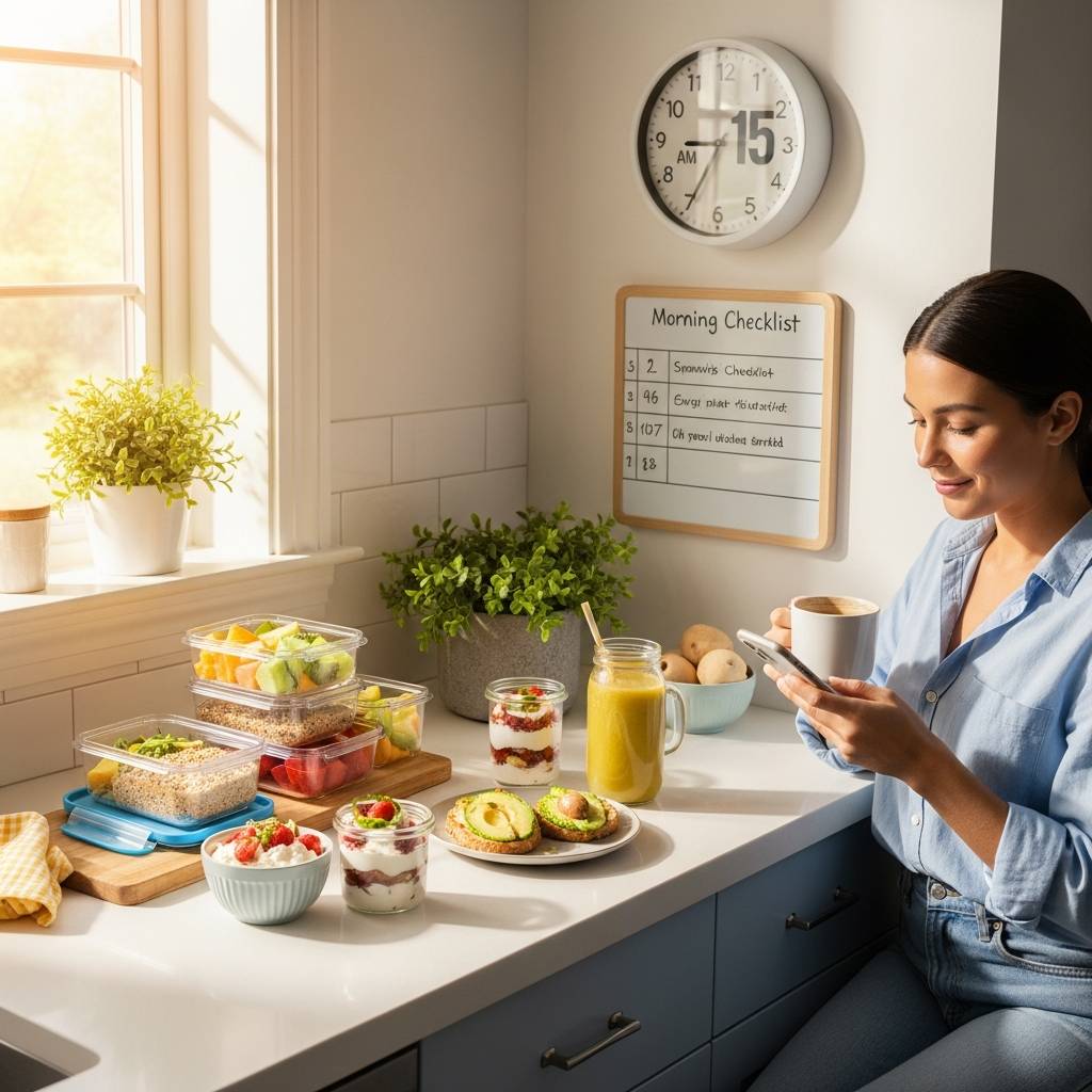 次に「朝食の下準備」が重要です。サラダの材料を洗って切っておいたり、スムージー用の果物を小分けにしてジップロックに入れておくだけで、朝の調理時間が半分以下になります。オートミールを容器に入れて冷蔵庫に置いておけば、朝はレンジで温めるだけで完成します。