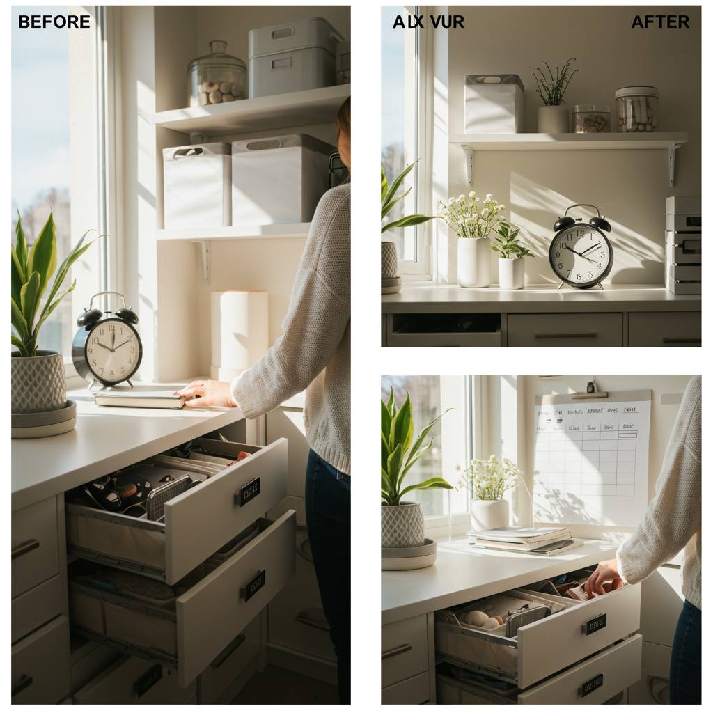 まず取り入れたいのが「ワンアクションルール」。手に取ったものは必ず定位置に戻す、という単純なルールです。朝の身支度後、使った化粧品や洋服をその場で5分かけて片付けるだけで、夕方帰宅したときの散らかり具合が格段に違います。
